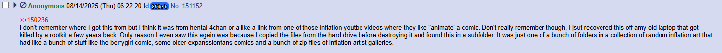 >>164710 >>164711 I got in contact with someone who worked on inflatedEgos with casualObsessive but he (CO) had never mentioned this comic before. I am pretty confident he is the creator though I've attached some examples of why I think that. In terms of leads though, I have absolutely nothing, I went back through a few years of /aco thread archives but theres no mention of it other than others asking the same question. Maybe if we could get in contact with the anon who has a giant 500 gb folder of inflation stuff we could find it but seeing as he's anonymous and his folder got nuked I don't hold high hopes. I have DMed casualobsessive on both his report my post and his deviantart but I don't hold out much hope for a response, maybe if you guys could could leave some comments on both his old deviantart and his new one: https://www.deviantart.com/2fast2casual Maybe he would see it and respond? Please don't harass the guy, we don't definitively know its by him.