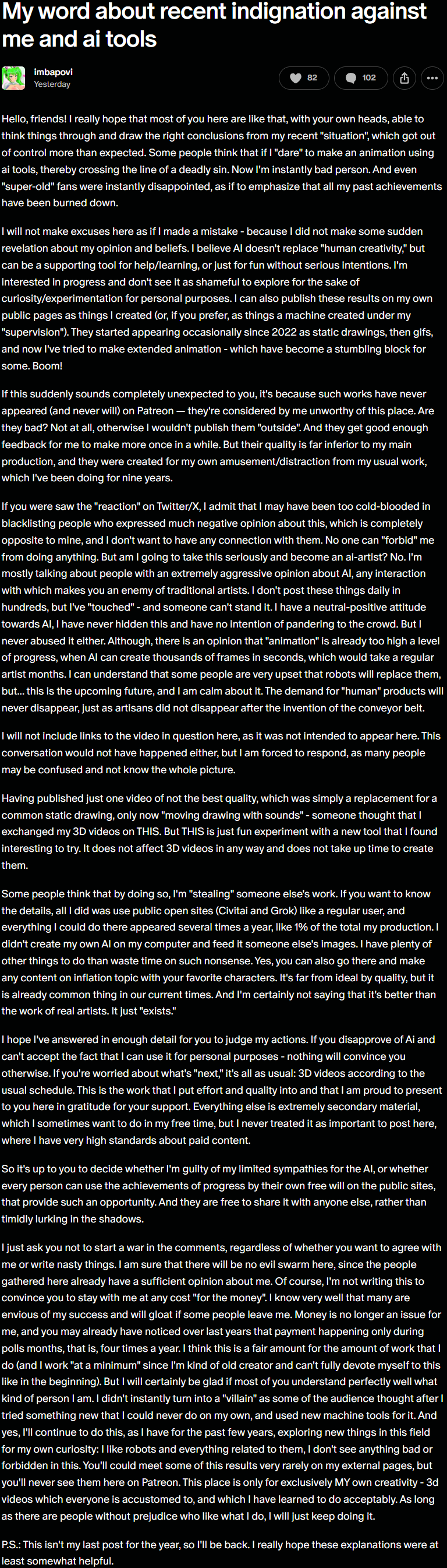 This AI drama does generate a lot of discussion, but the overwhelming majority of it is from other artists being furious. Those opinions don't really matter. The only thing that really matters is the paying patrons count, and the dip in those has been negligible so far.