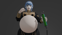 While traveling down a road, Raiden is confronted by an enemy. To eliminate the threat, she begins to pull out her sword from her chest. Partway through, however, her sword becomes stuck, and she can't pull it out any further. She gives it a few tugs, but her sword then releases a bolt of lightning into her body. This causes her breasts to begin swelling, straining the top of her kimono while she tries to use one arm to hold them as the other continues to grab her sword. Another jolt of lightning is released and now her butt starts swelling as well, pushing up her kimono and stretching out her panties. A third jolt hits her and now her belly rapidly begins to swell, swiftly snapping the sash around her waist and becoming the largest part of her body. Her breasts, butt, and belly all swell up together for a short time before stopping, leaving her clothes barely hanging on to her inflated body. Seeing the enemy still in front of her, she gives one last tug to her sword, before a much larger bolt of lightning is released from the sword into her body. Her breasts, butt, and belly all begin to heavily swell outward, with her breasts bursting from her top and her butt destroying her panties, leaving her in just her sleeves and stockings. She can only ride it out with her hands on her breasts as her body swells up to the size of a house before her sword pops out on its own. It bounces down her body and lands outside her reach, leaving her inflated form immobile and helpless.