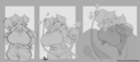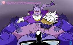 >If any onlookers could see you, they'd see a massive gut first, easily 10 feet across, with uncovered hips that were slowly starting to peek out aroubd them, underwear in shreds but barely holding on by the elastic.