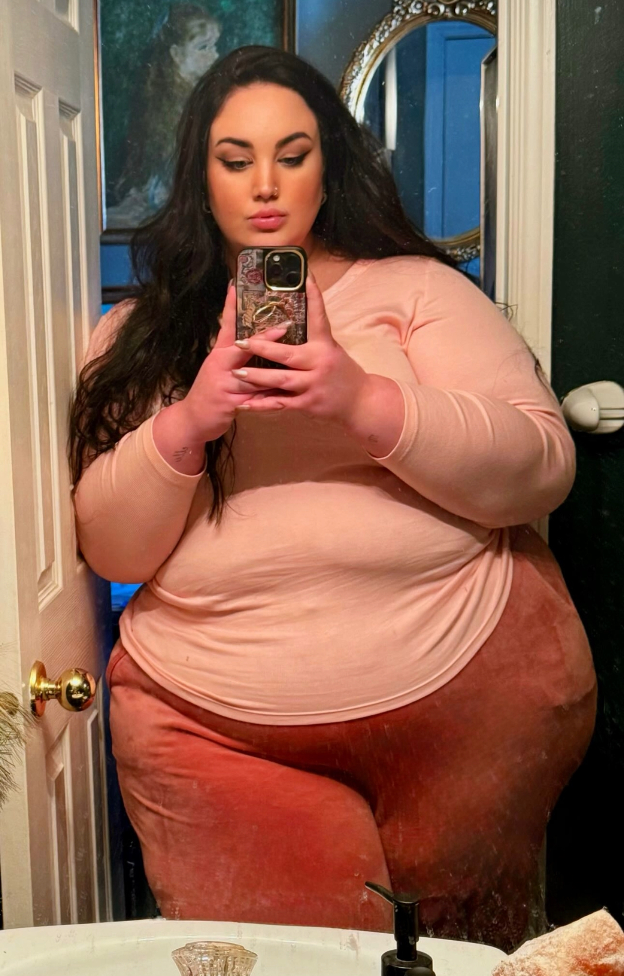 I could now legitimately believe that she’s wider than her bathroom door, looking like this. The previous times where here hips barely brush the frame were meh. This is on the cusp of stuckage.