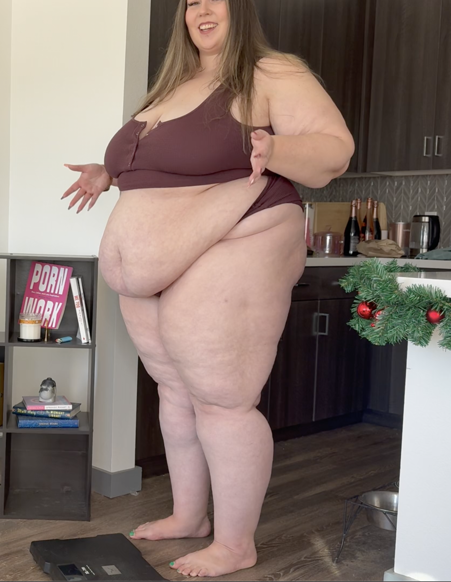 She was 526 in her last weight in about a year ago and in recent video descriptions, she's mentioned weighing 525. I don't think she's lost or gained an especially large amount since beyond normal fluctuations at that size. She's also a shapeshifter; her height can make her look a lot thinner standing up and then, yeah, a car video has her belly spilling onto the steering wheel and you realize how massive she is.