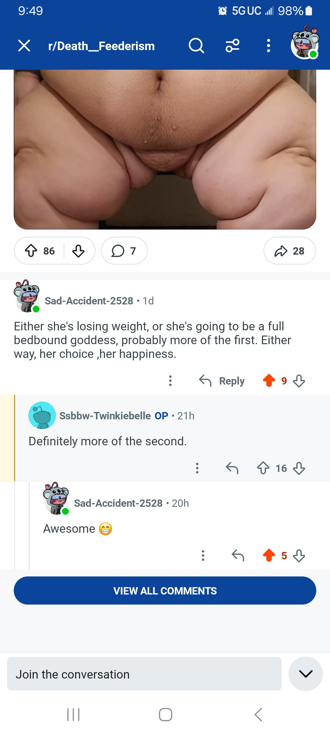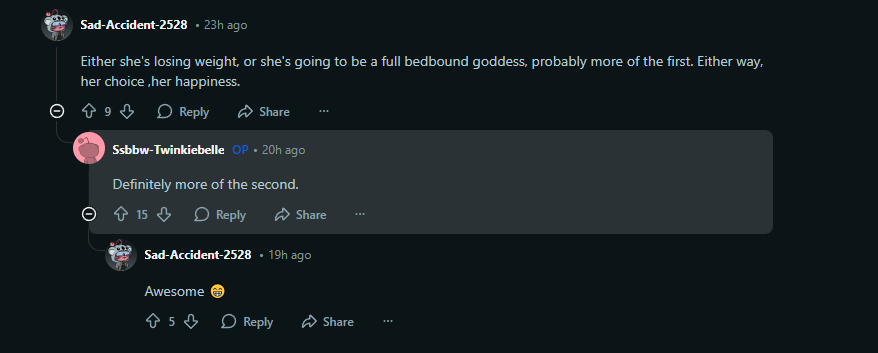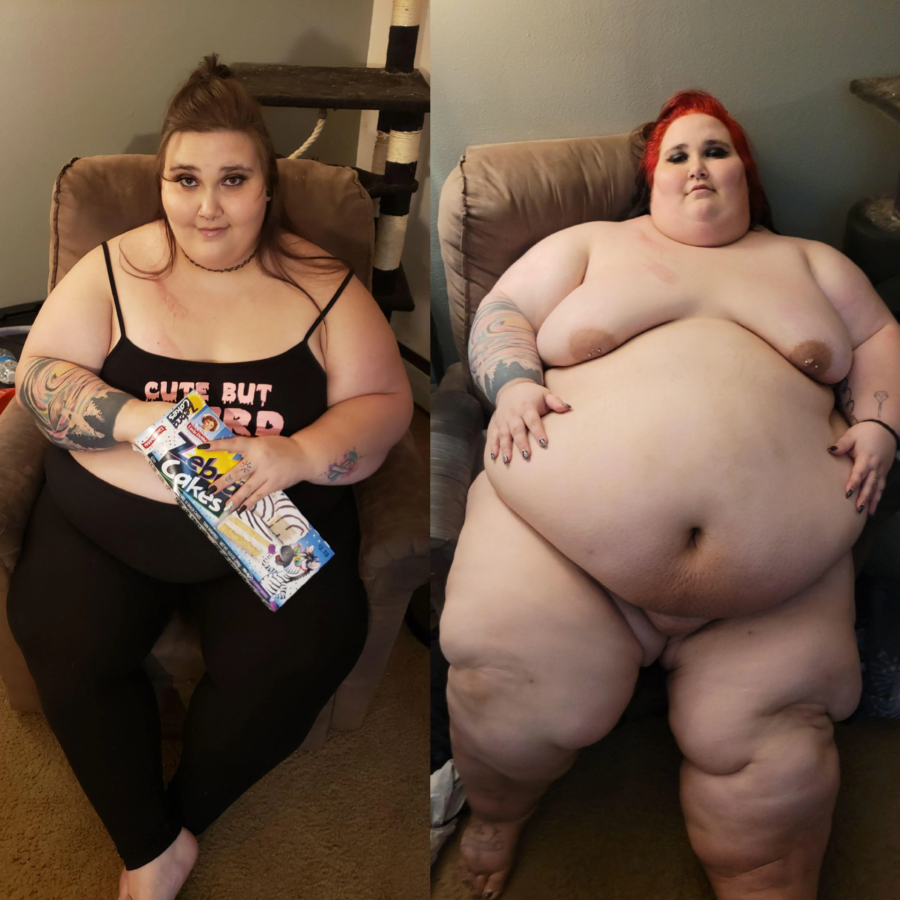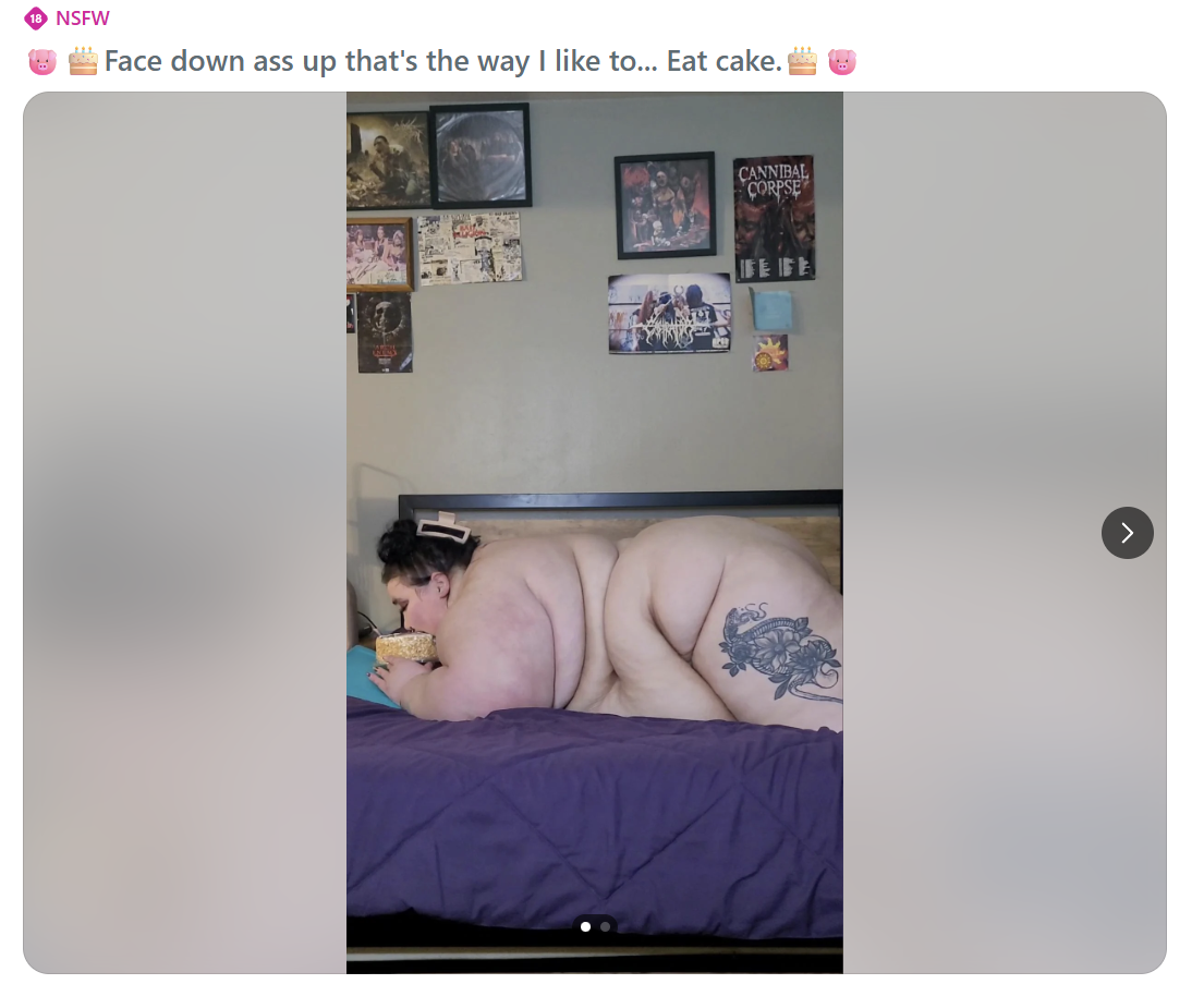 Whilst I don't like the double charging... i mean, it's definitely going towards feeding her. I bought one of her last videos, and she walked like 2 feet from a chair to her bed and was winded - she even said she pretty much does nothing but wake up and eat, and moved her bed into her living room, so is right near the fridge and her kitchen. This is a prime example of an SSBBW that is ploughing all her modeling money into reaching immobility, and she's practically already there.