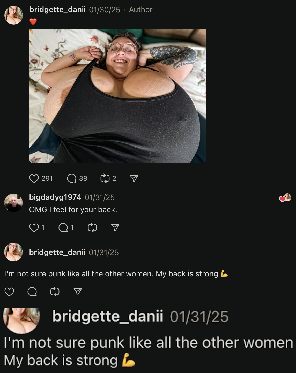 IDK if "sure punk" was a typo? But its cool to see her "strong back" comment and that she was good on shutting these horseshit comments down. The back pain "jokes" these girls get spammed with from every GD smooth-brain dumbshit with original thought processing capability. It's not even that much a concern for a large portion of huge-boobed girls, my GF of 9 years went from 40G to 46M and she'd sometimes complain about shoulders at first and annoyed about bulging or outgrowing stuff but after teaching her basic strength training stuff it only took 2 months of gym before she never had back or shoulder issues again. >>283325 You're aware what funeral home embalming fluid smells like... how? >>283688 Rigamortis?? Well... RIP, Crazy young for her. Heck, I'm just a year older than she was.